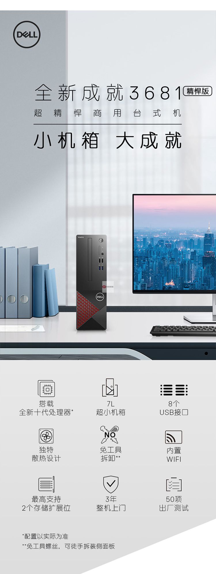 自營戴爾(DELL)成就3681英特爾酷睿i3商用辦公高性能臺式機電腦整機(十代i3-10100 8G 1T 三年上門售后)21.5英寸
