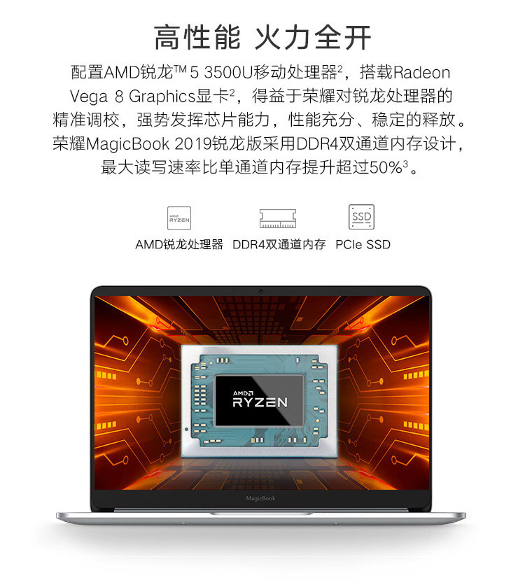 自營榮耀MagicBook 2019 14英寸輕薄窄邊框筆記本電腦(AMD銳龍5 3500U 8G 512G FHD IPS 指紋解鎖)冰河銀