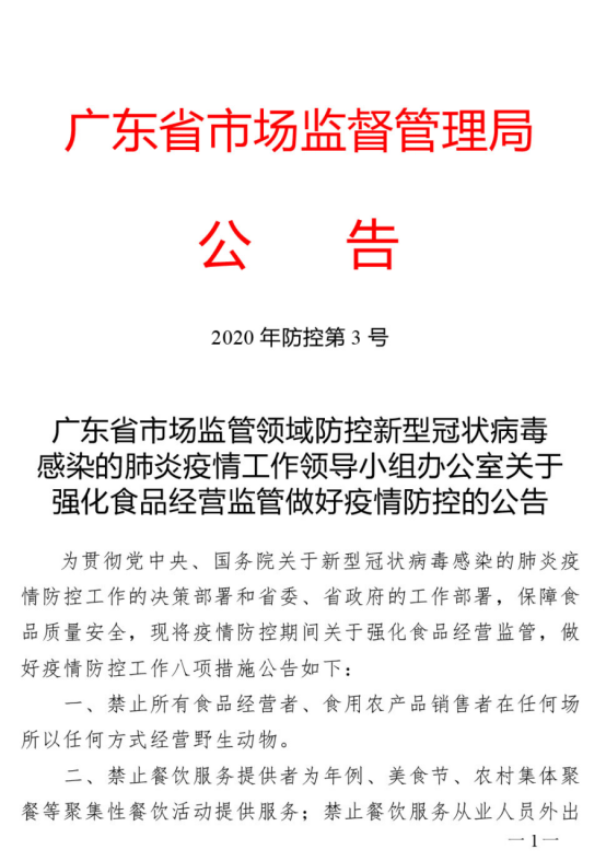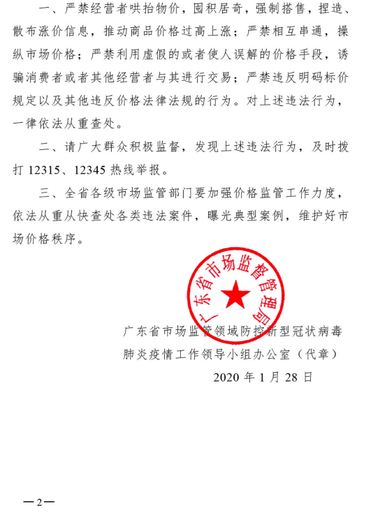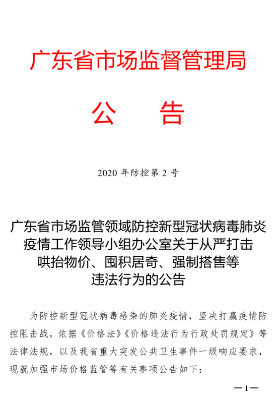 廣東省市場(chǎng)監(jiān)管領(lǐng)域防控新型冠狀病毒肺炎疫情工作領(lǐng)導(dǎo)小組辦公室關(guān)于從嚴(yán)打擊哄抬物價(jià)、囤積居奇、強(qiáng)制搭售等違法行為的公告
