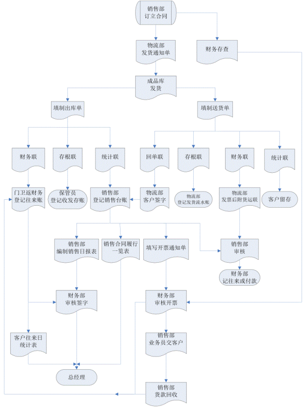 物流部開(kāi)具《發(fā)貨通知單》通知成品庫(kù)保管員發(fā)貨,保管員填制《產(chǎn)品出庫(kù)單》(一式三聯(lián))和《產(chǎn)品送貨單》(一式四聯(lián))。《產(chǎn)品出庫(kù)單》:保管員依據(jù)存根聯(lián)登記《產(chǎn)品收發(fā)存賬》;統(tǒng)計(jì)聯(lián)交與銷售部,銷售部登記《產(chǎn)品銷售臺(tái)賬》;財(cái)務(wù)聯(lián)由物流部或司機(jī)作為出門(mén)憑證交與門(mén)衛(wèi),門(mén)衛(wèi)交與財(cái)務(wù)部,財(cái)務(wù)部登記《客戶往來(lái)臺(tái)賬》,并根據(jù)《客戶往來(lái)臺(tái)賬》編制《客戶往來(lái)日統(tǒng)計(jì)表》,報(bào)總經(jīng)理。《產(chǎn)品送貨單》:存根聯(lián)交由物流部登記《產(chǎn)品發(fā)貨流水賬》;統(tǒng)計(jì)聯(lián)和回單聯(lián)隨貨同行,統(tǒng)計(jì)聯(lián)交由客戶,回單聯(lián)由客戶簽字后物流部交與銷售部(如客戶不在《產(chǎn)品送貨單》回單聯(lián)上簽字,則應(yīng)取得客戶開(kāi)具的收貨憑證,并附《產(chǎn)品送貨單》回單聯(lián)后),銷售部據(jù)此登記《產(chǎn)品銷售臺(tái)賬》,每日根據(jù)《產(chǎn)品銷售臺(tái)賬》編制《產(chǎn)品銷售日?qǐng)?bào)表》(一式三份,銷售部留底、財(cái)務(wù)部、總經(jīng)理)經(jīng)財(cái)務(wù)部審核后報(bào)總經(jīng)理,每月結(jié)賬日后根據(jù)《產(chǎn)品銷售臺(tái)賬》編制《銷售合同履行一覽表》報(bào)總經(jīng)理,根據(jù)《產(chǎn)品銷售臺(tái)賬》填制《開(kāi)票通知單》(一式二份)通知財(cái)務(wù)開(kāi)具發(fā)票,銷售部通知財(cái)務(wù)開(kāi)票時(shí),應(yīng)將客戶簽字后的《產(chǎn)品送貨單》回單聯(lián)或客戶的收貨憑證附于《開(kāi)票通知單》后,開(kāi)票后應(yīng)在《產(chǎn)品送貨單》回單聯(lián)和客戶的收貨憑證上加蓋“已開(kāi)票”印章,發(fā)票財(cái)務(wù)記賬后附《開(kāi)票通知單》入賬,《產(chǎn)品送貨單》回單聯(lián)和客戶收貨憑證附發(fā)票客戶聯(lián)后向客戶結(jié)算,另一份《開(kāi)票通知單》填寫(xiě)開(kāi)票信息后返回銷售部;《產(chǎn)品送貨單》財(cái)務(wù)聯(lián)由物流部保存或交由司機(jī),作為運(yùn)費(fèi)結(jié)算的憑證,附于運(yùn)費(fèi)發(fā)票后結(jié)賬,財(cái)務(wù)審核后應(yīng)在《產(chǎn)品送貨單》財(cái)務(wù)聯(lián)上加蓋“注銷”印章。