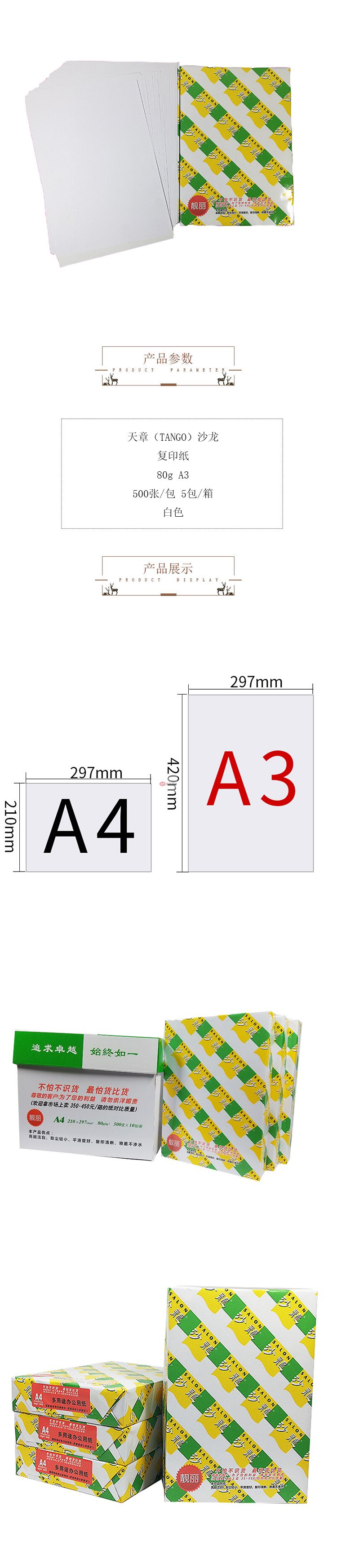 商品名稱:天章(TANGO)沙龍復印紙 80g A3 500張/包 5包/箱 白色