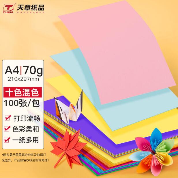 自營(yíng)天章(TANGO)新綠天章A4彩紙十色混色 彩色打印紙復(fù)印紙 彩色卡紙非硬 彩色紙兒童手工折紙剪紙 混色80g100張