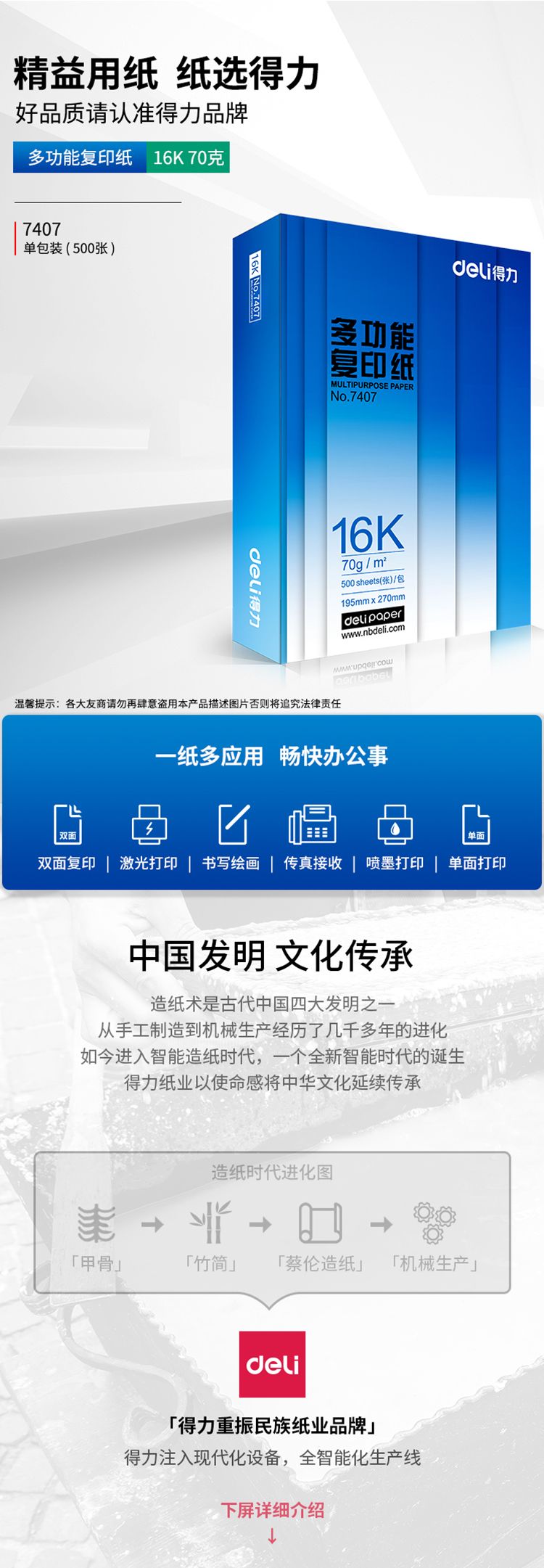 商品名稱:得力(deli) 復(fù)印紙 7408 幅面:16K 克重:70g 包裝規(guī)格:500張/包 白色
