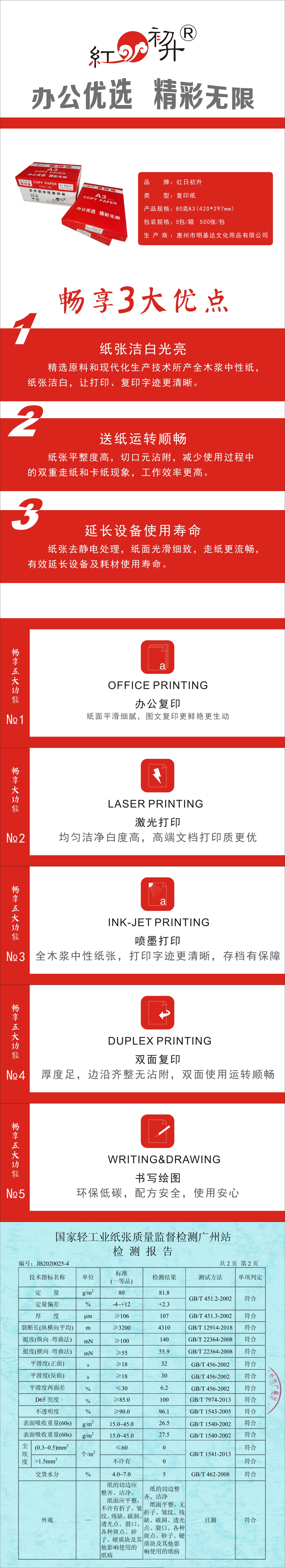 自營(yíng)紅日初升 紅日初升 A3 80g 復(fù)印紙 500張/包 5包/箱 A3/80G