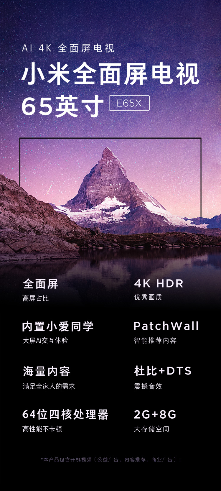 商品名稱:小米(MI)電視E65X 65英寸 全面屏 4K超高清HDR 藍(lán)牙遙控內(nèi)置小愛(ài) 2 8GB AI人工智能液晶網(wǎng)絡(luò)平板電視 L65M5-EA