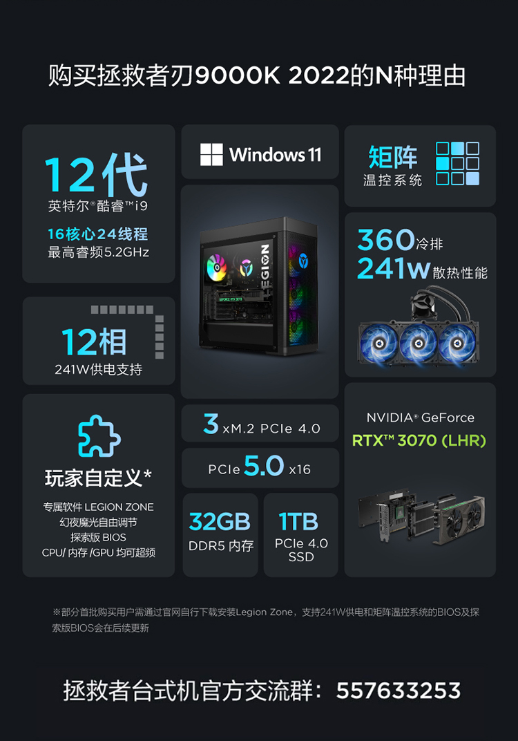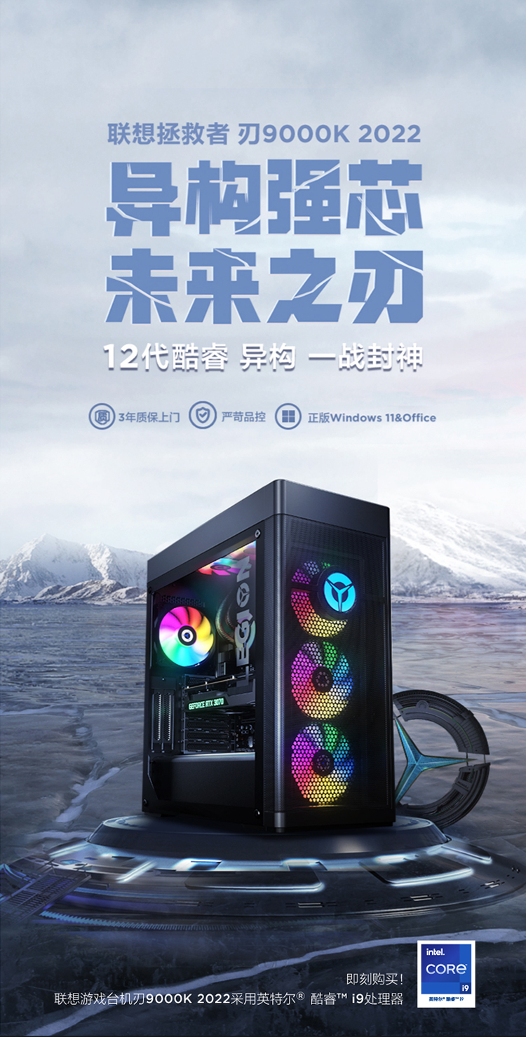自營聯(lián)想(Lenovo)拯救者刃9000K 2022游戲電腦主機(12代酷睿i9-12900KF RTX3070 32G DDR5 1TB SSD 側透 )