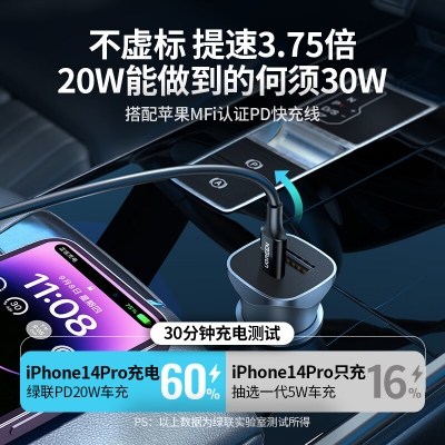商品名稱:綠聯(lián)車載充電器PD20W超級快充汽車點煙器USB擴(kuò)展口車充轉(zhuǎn)換插頭蘋果14
