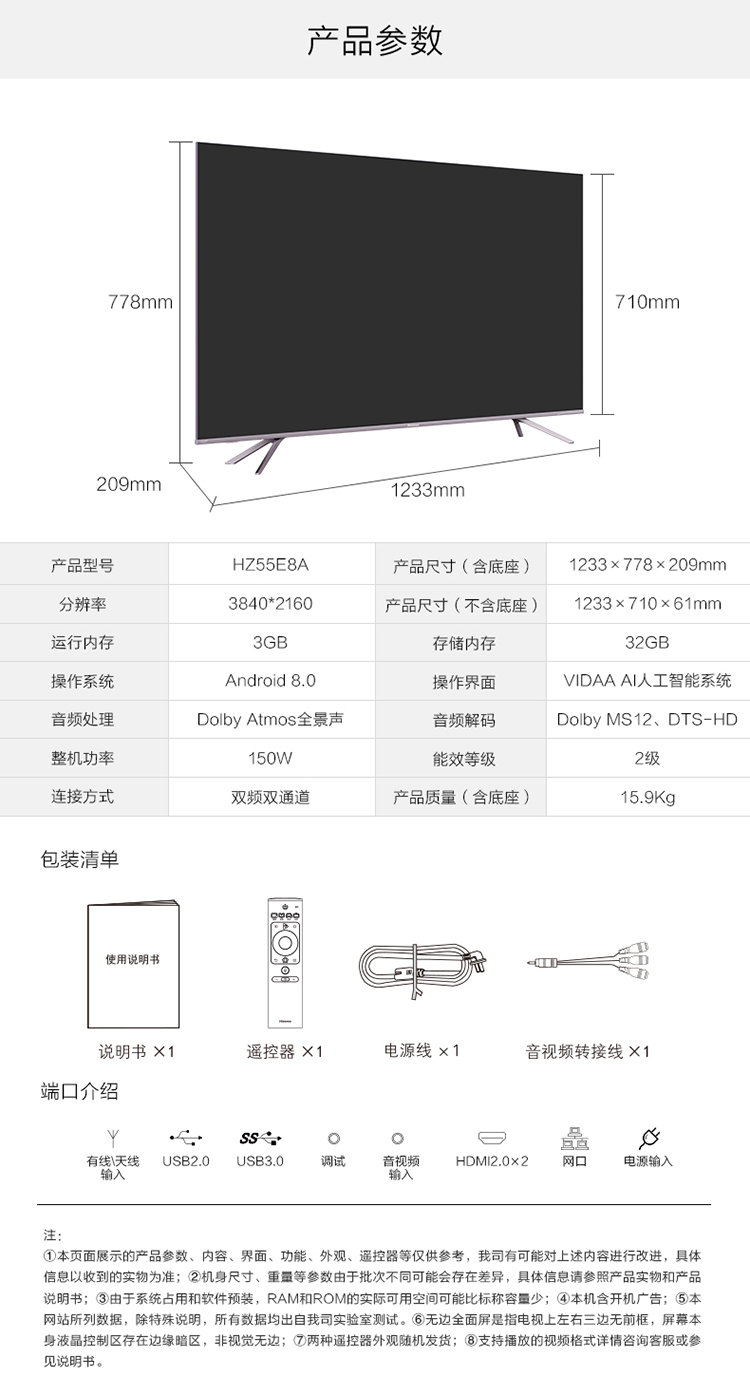 商品名稱:海信(Hisense)HZ55E8A 55英寸 4K ULED超畫質(zhì) 量子點(diǎn) 超薄全面屏 AI人工智能液晶電視機(jī)