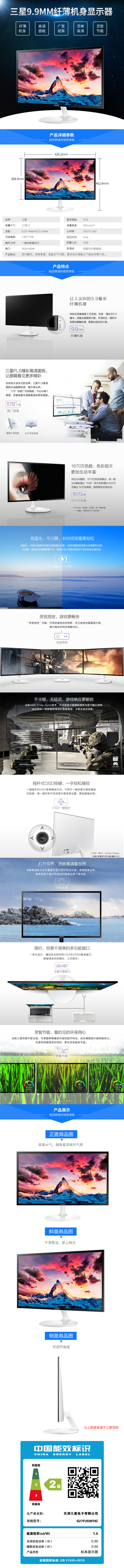 商品名稱:三星(SAMSUNG)S27F359FHC 27英寸液晶顯示器 1920X1080分辨率 PLS面板 屏幕比例16:9 一年保修