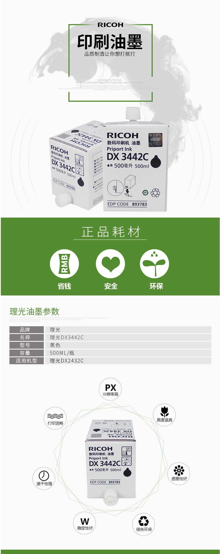 商品名稱:理光(Ricoh) DX3442C 黑油墨(用于DX-2430C/3442C/2432C) 單支