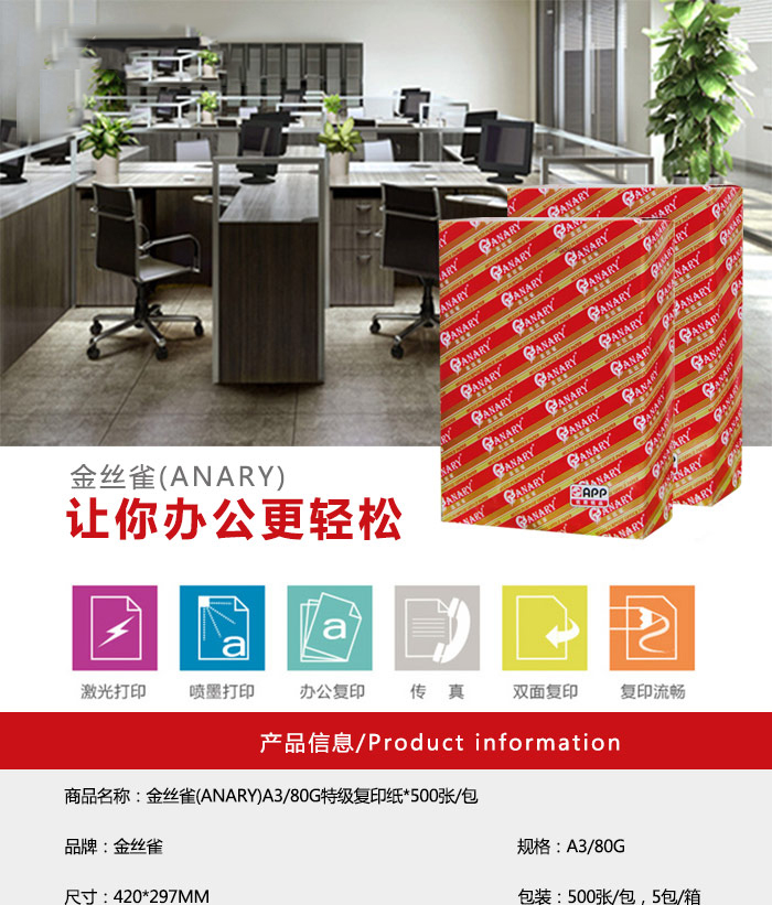 自營金絲雀(ANARY) 8K/80G 特級復印紙*500張/包*5包 白色