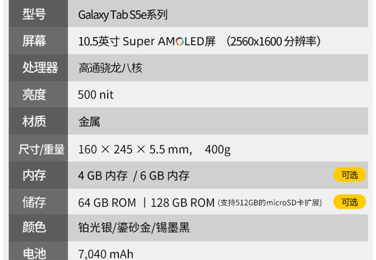 商品名稱:三星(SAMSUNG) Tab S5e 平板電腦 10.5英寸 6+128G(4G通話版)