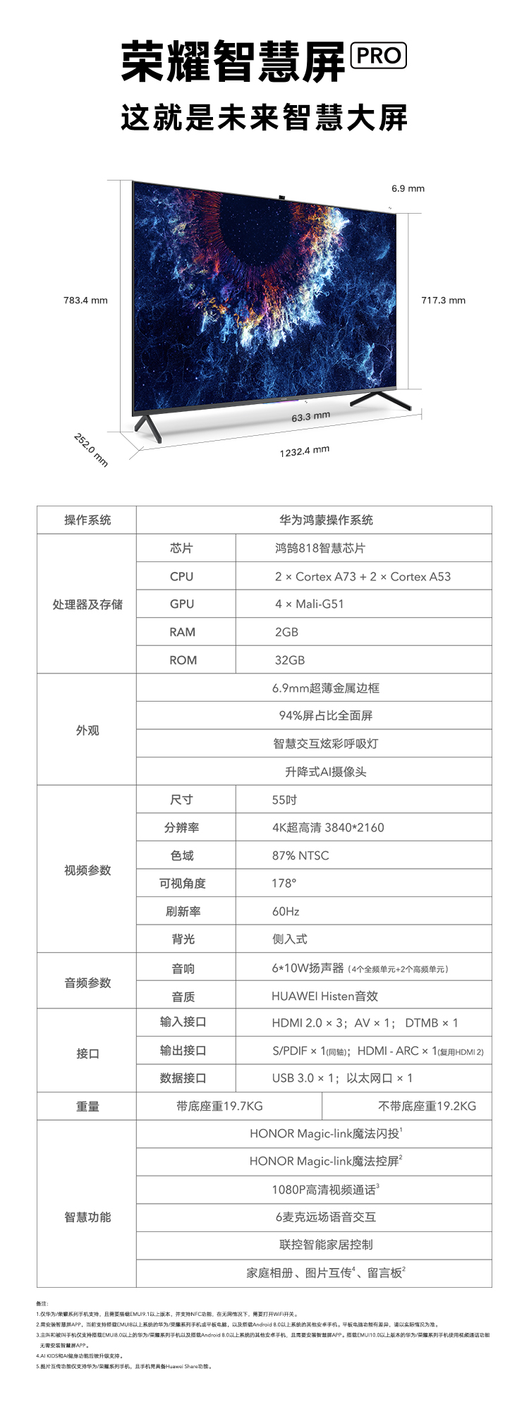 自營(yíng)榮耀智慧屏Pro 55英寸 2G+32G 視頻通話 遠(yuǎn)場(chǎng)語(yǔ)音 4K超高清 人工智能液晶電視 華為超薄金屬全面屏OSCA-550